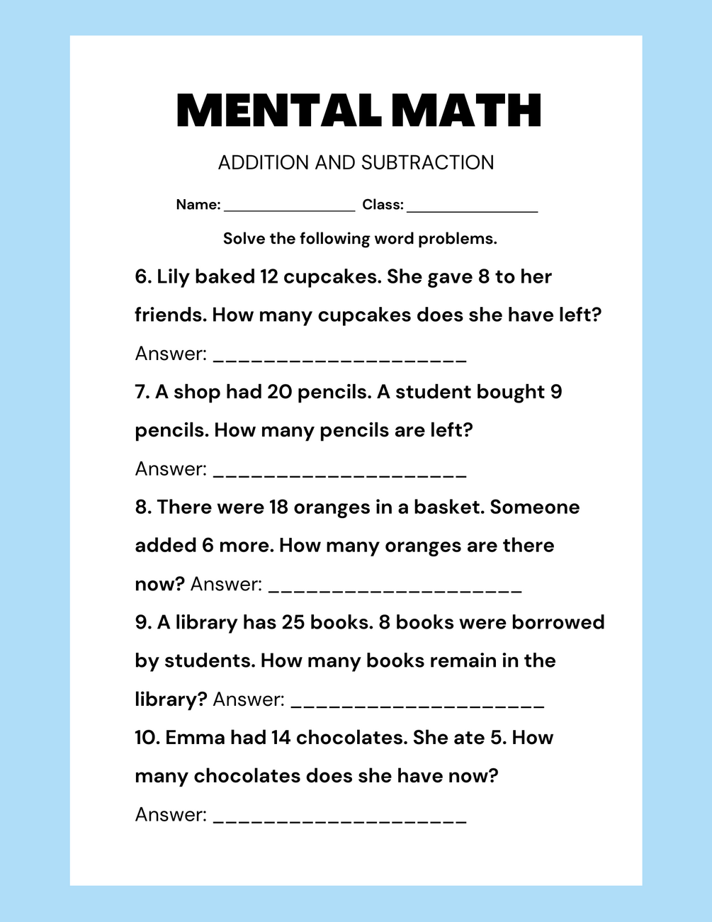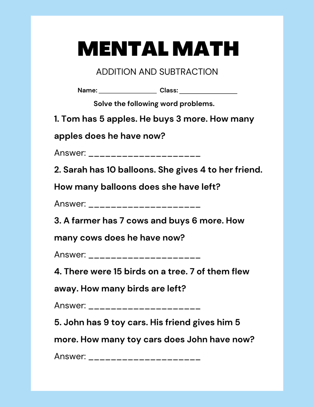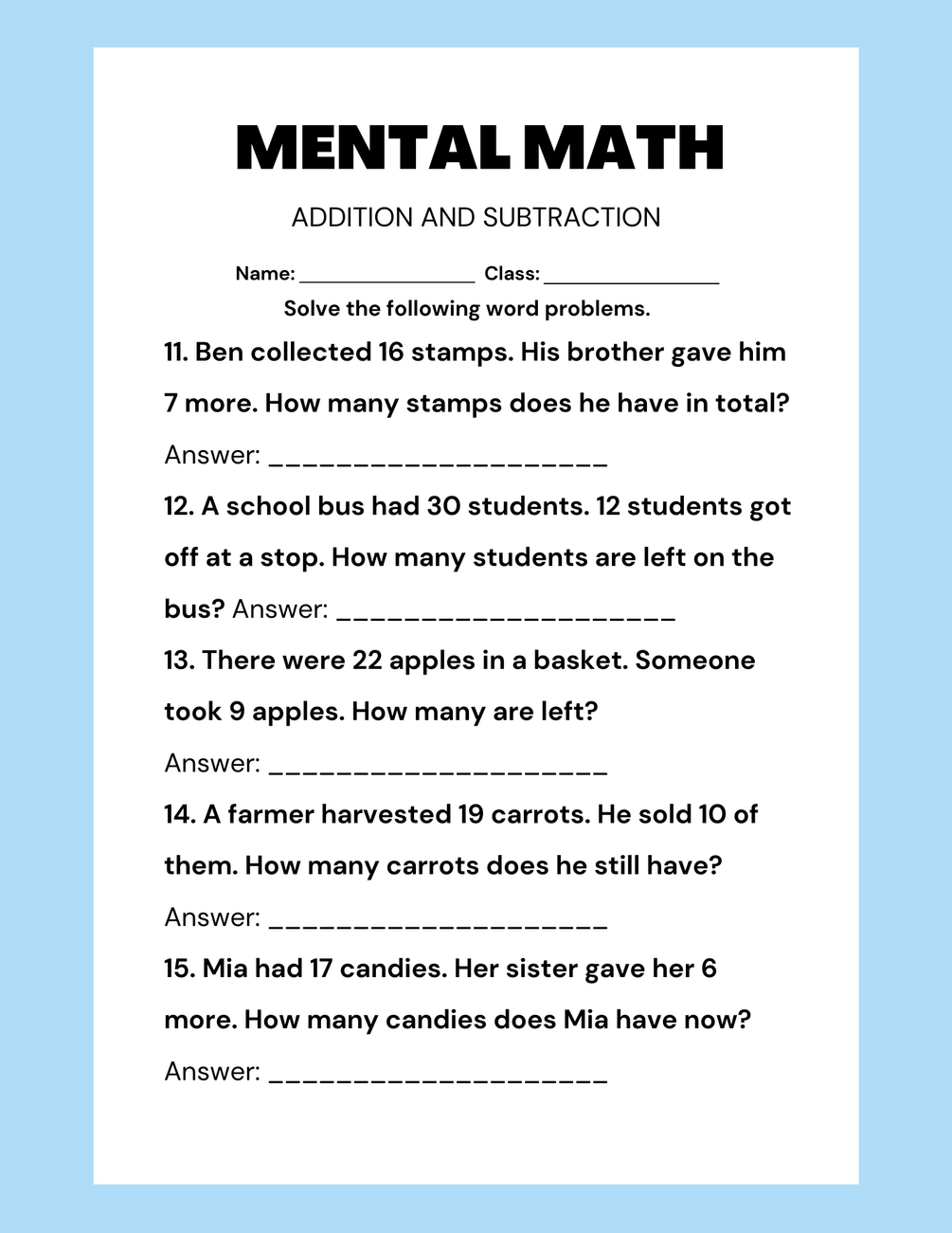 Make learning math fun with this printable Addition and Subtraction Word Problems Worksheet designed for primary school students! Featuring 15 carefully crafted word problems, this worksheet helps young learners develop their problem-solving skills while reinforcing basic addition and subtraction concepts.